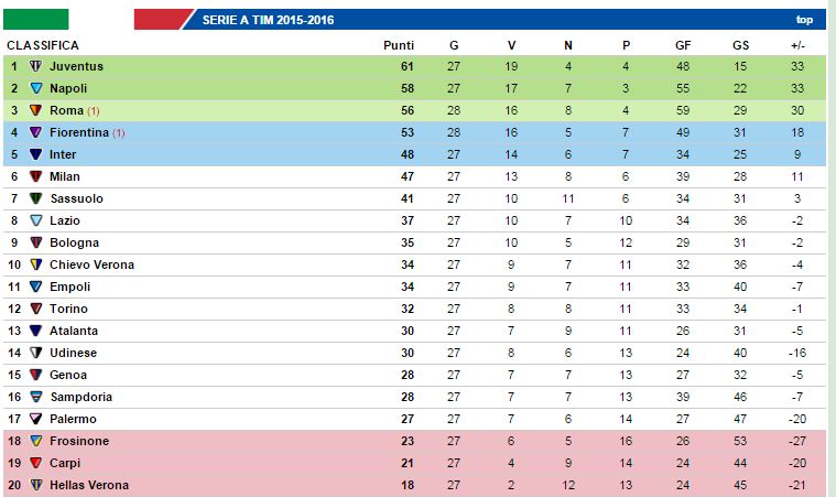 La Roma vince lo contro diretto ed è da sola al terzo posto in classifica. La formazione di Spalletti, con un match in più, è a soli due punti di distanza dal Napoli. Ecco la classifica completa: