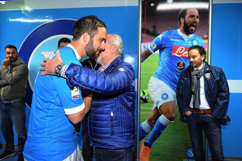 Nel post-partita, dopo la festa sul campo, Gonzalo Higuain ha ricevuto anche l'abbraccio di Aurelio De Laurentiis. Lo scatto è tratto dalla gallery sul sito ufficiale della Ssc Napoli