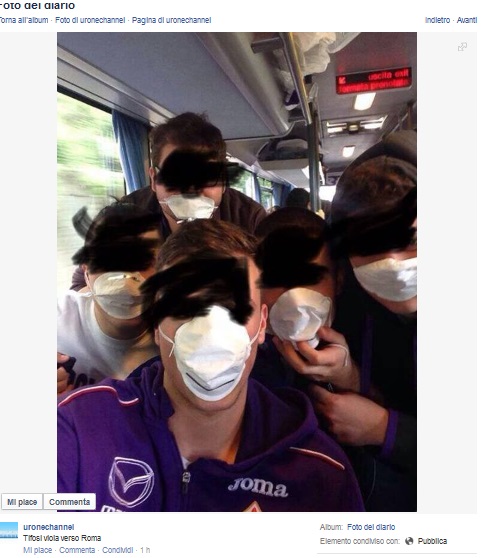 La pagina Facebook ‘Urone Channel’ ha pubblicato una immagine legata ad alcuni tifosi della Fiorentina che stanno raggiungendo Roma in vista della finale di Coppa Italia contro il Napoli. Questi pseudo-sostenitori viola diretti all'Olimpico si sono fatti fotografare con una mascherina, gesto razzista che emula quello legato ad alcuni tifosi della Juventus risalente a qualche settimana fa in vista della sfida contro gli azzurri.