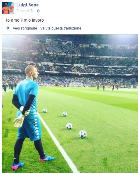 "Io amo il mio lavoro" ha scritto sul suo profilo Facebook Luigi Sepe, portiere del Napoli. L'ex Empoli ha postato una foto che lo ritrare al Bernabeu, era la vigilia del match di Champions contro il Real Madrid. Futuro in bilico per lui, neppure una presenza in azzurro quest'anno. Ecco il suo post: