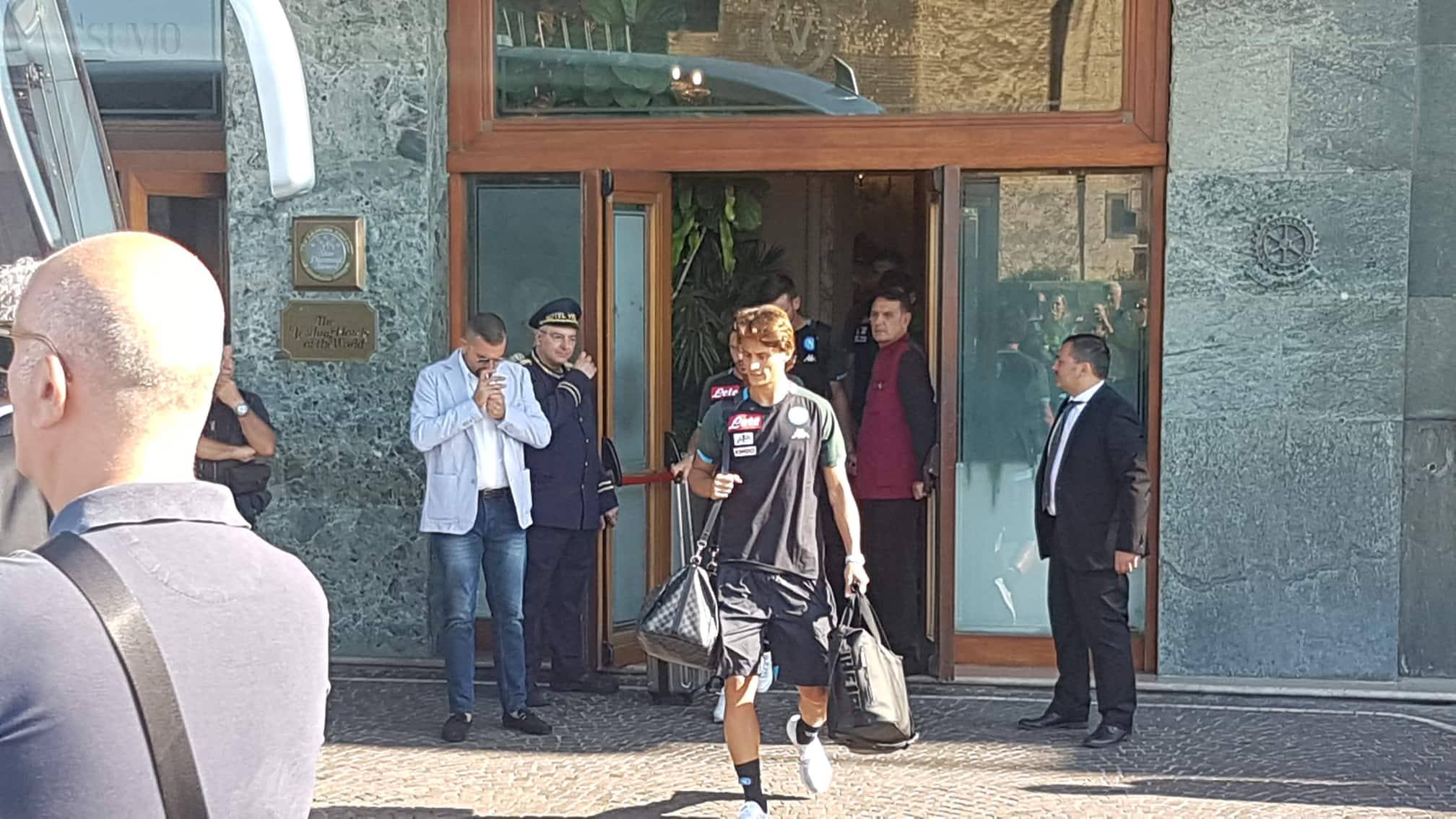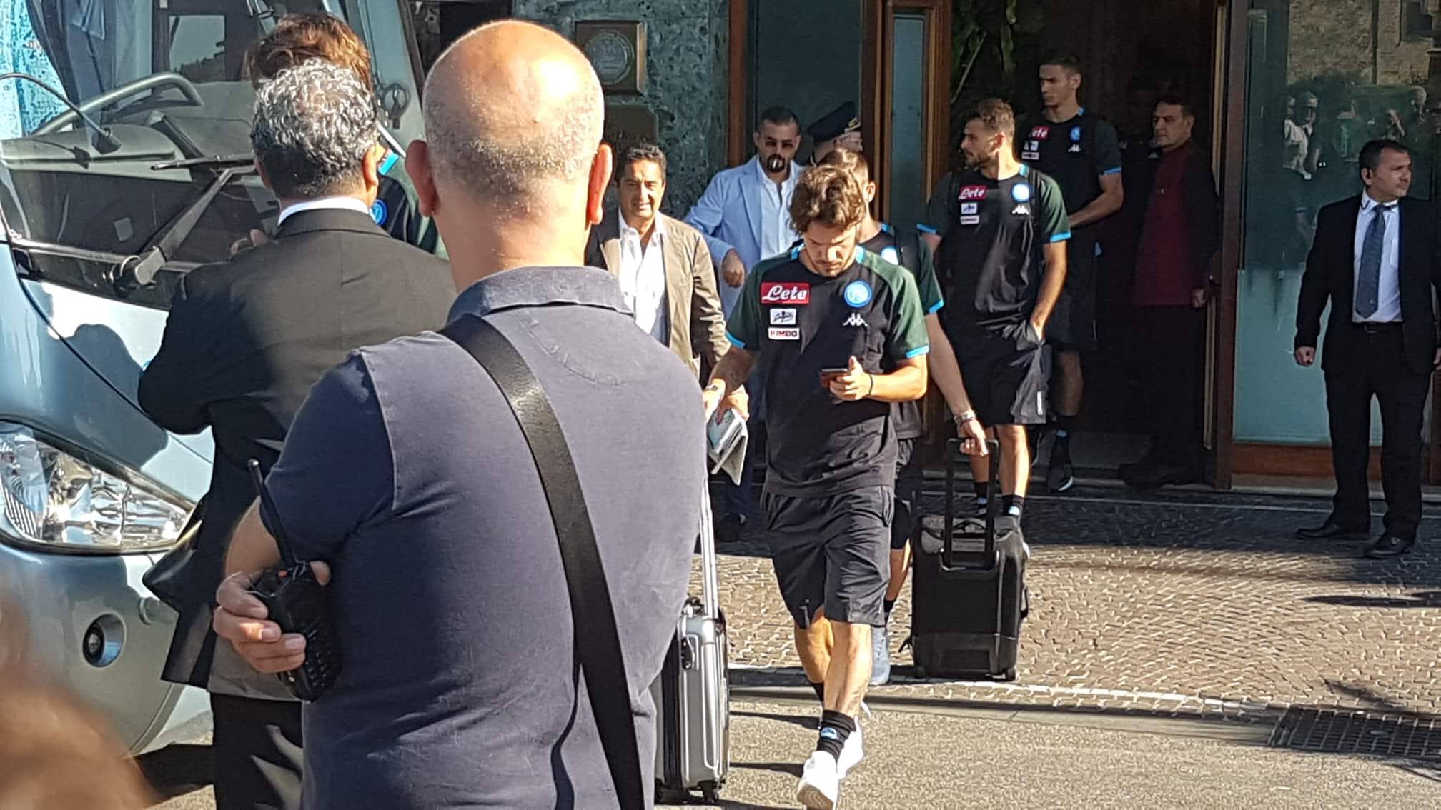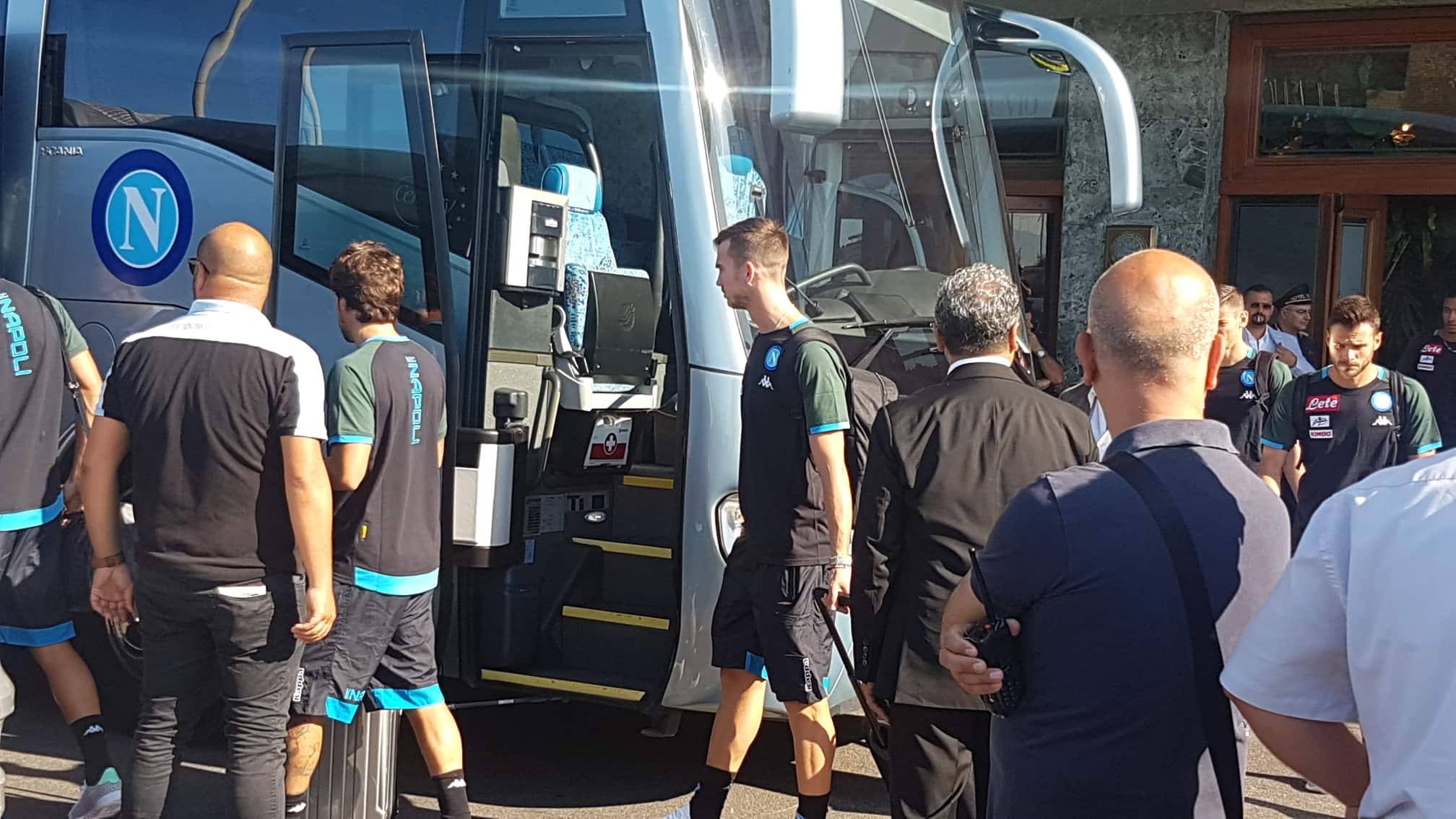 Il Napoli è ormai pronto a partire verso Dimaro. Dopo aver prelevato alcuni giocatori all'esterno dello stadio San Paolo, altri sono saliti sul pullman dall'Hotel Vesuvio. C'era Carlo Ancelotti, seguito dai nuovi acquisti: Verdi, Inglese, Fabiàn, Karnezis hanno raggiunto i compagni sul pullman. Di seguito le nostre immagini.