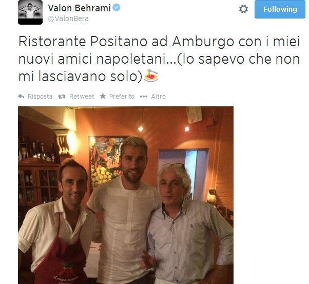 Sul proprio profilo Twitter, Valon Behrami ha mostrato una foto in un ristorante napoletano ad Amburgo: "Ristorante Positano ad Amburgo con i miei nuovi amici napoletani...(lo sapevo che non mi lasciavano solo)".