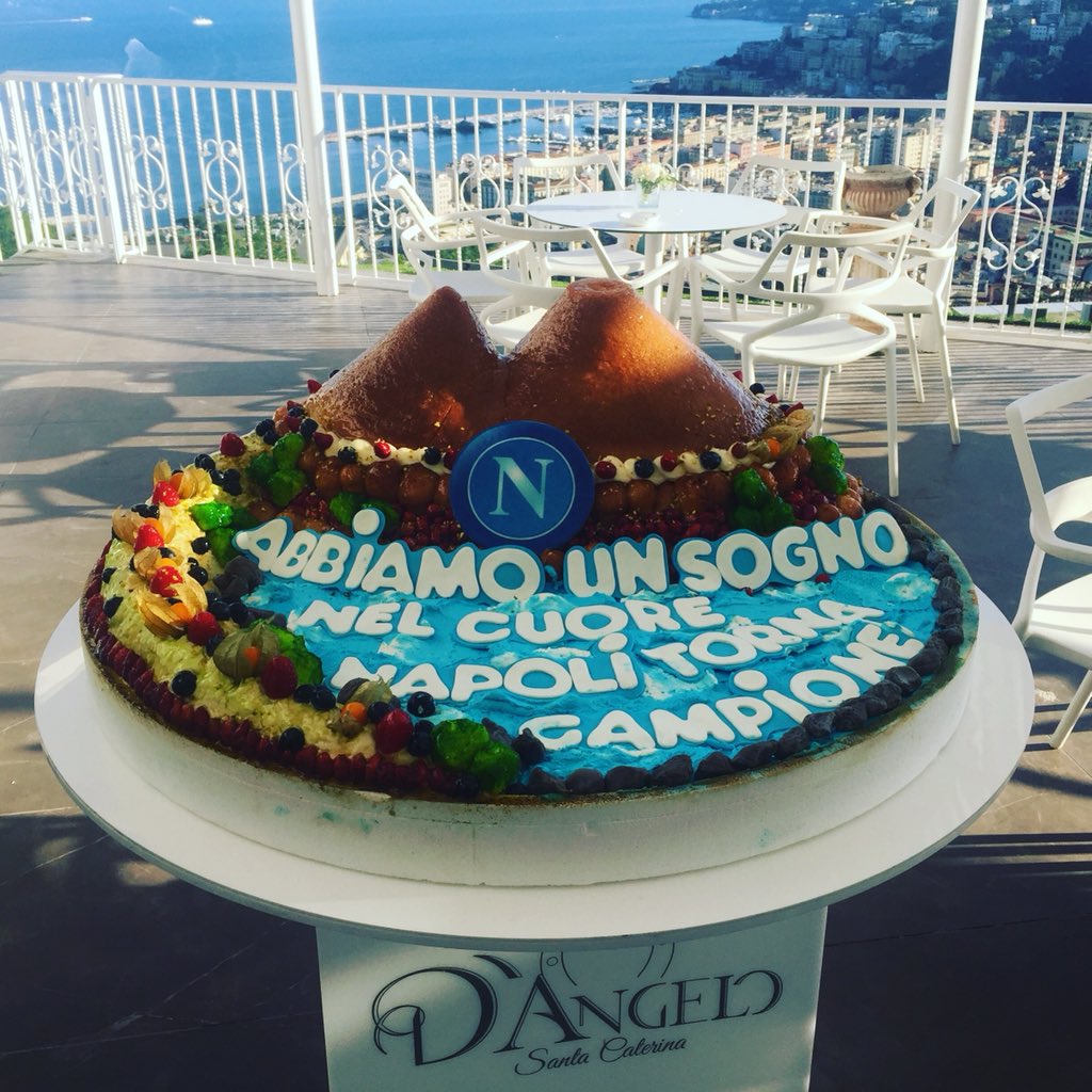 Una bellissima torta, quella per la cena di fine anno del Napoli. Un dolce molto particolare, con un babà a forma di Vesuvio ed una scritta in pasta di zucchero che richiama al famosissimo coro che ha accompagnato la squadra per tutto l'anno. Questa la foto pubblicata dal collega Diego De Luca su Twitter.