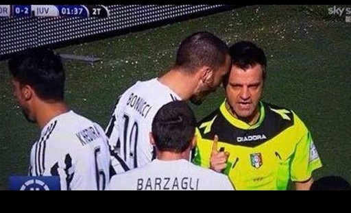 Sta facendo il giro del web un'immagine del difensore bianconero Leonardo Bonucci, che all'inizio del secondo tempo del match col Torino ha protestato in maniera veemente nei confronti dell'arbitro Rizzoli, arrivando addirittura ad un minaccioso testa a testa che gli è costato appena il cartellino giallo