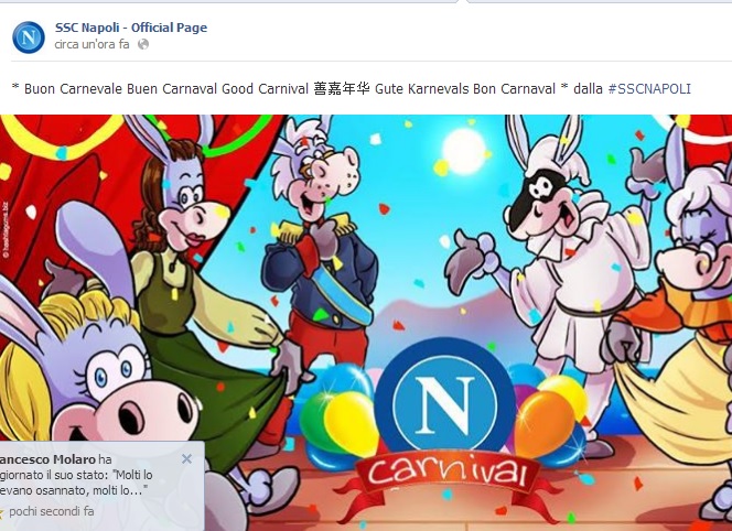 "Buon Carnevale Buen Carnaval Good Carnival 善嘉年华 Gute Karnevals Bon Carnaval * dalla Ssc Napoli". Questo il messaggio che il Napoli ha pubblicato su Facebook con un lavoro grafico molto simpatico.