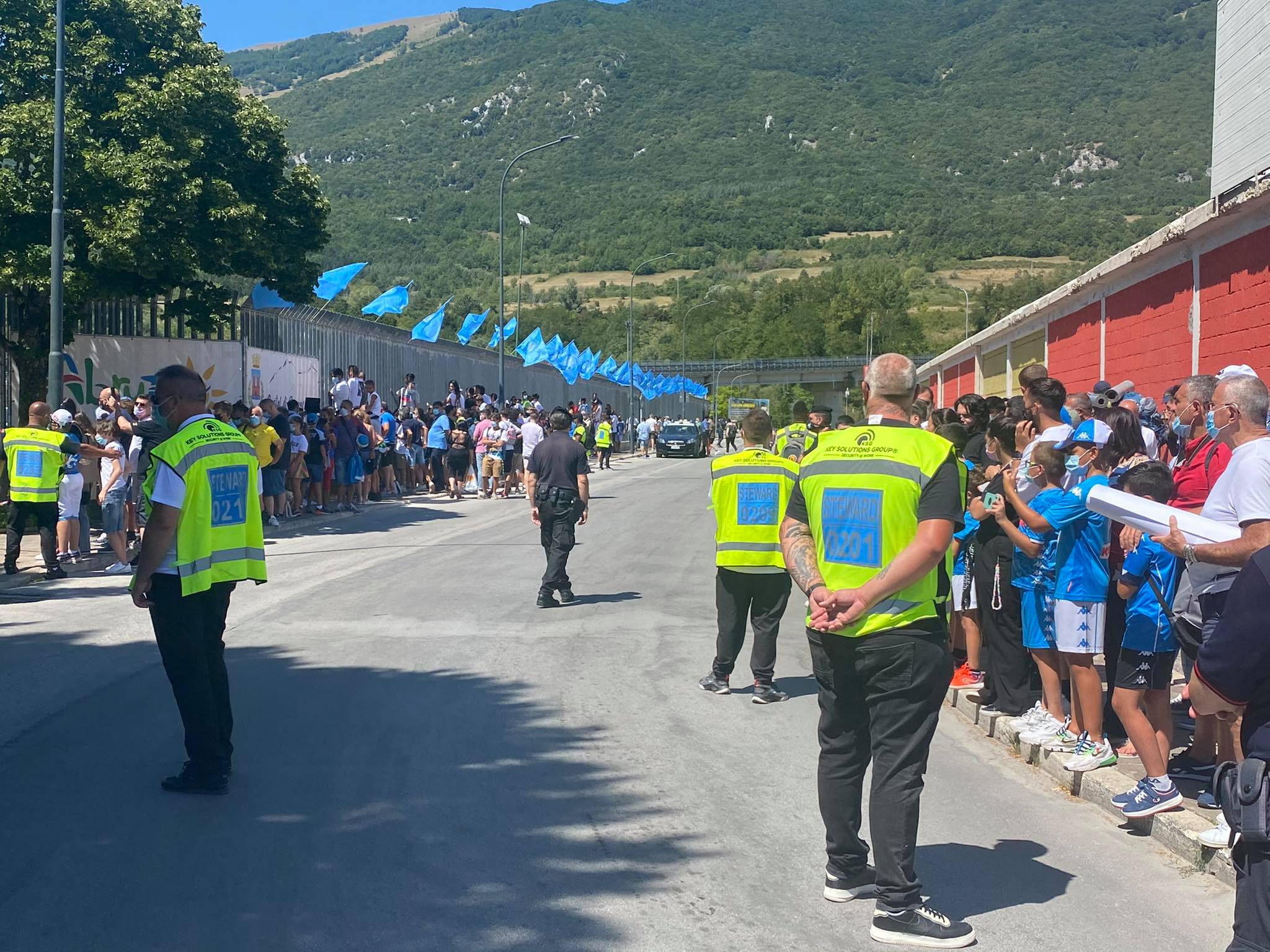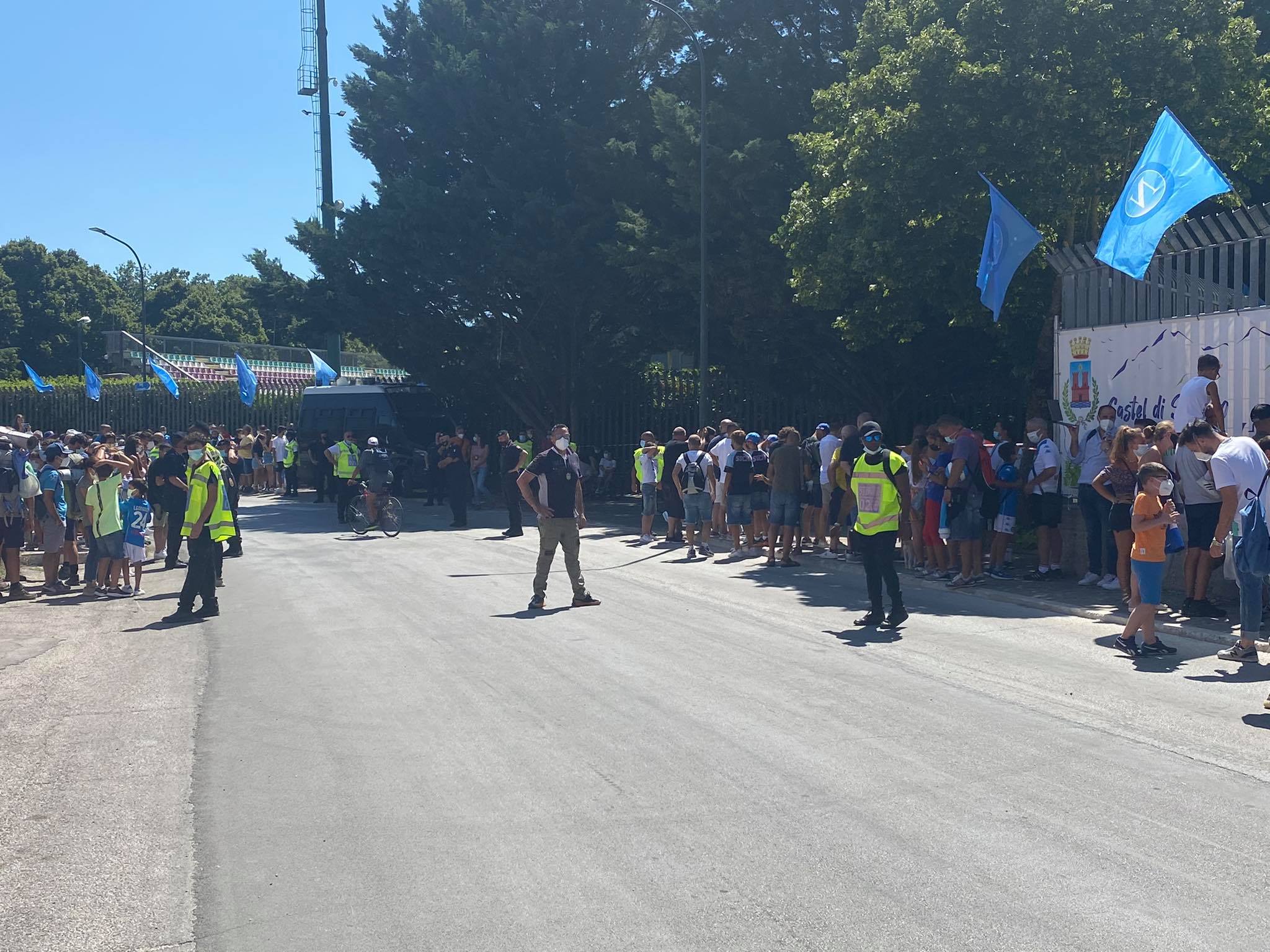 Arriva il weekend e cresce la presenza di tifosi del Napoli nel ritiro di Castel di Sangro. In tanti in fila questa mattina per l'allenamento mattutino e poi al termine in centinaia hanno atteso l'uscita del pullman degli azzurri, ma senza la possibilità di entrare a contatto con gli azzurri naturalmente per le normative anti-Covid.
