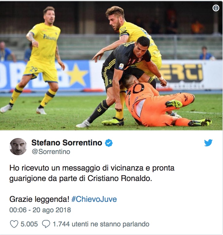 Il portiere del Chievo Verona, Stefano Sorrentino, ha postato un altro messaggio sul proprio profilo Twitter ringraziando CR7 che ha scritto all'estremo difensore gialloblù dopo lo scontro nel finale di gara della partita di sabato pomeriggio: "Ho ricevuto un messaggio di vicinanza e pronta guarigione da parte di Cristiano Ronaldo. Grazie leggenda!".