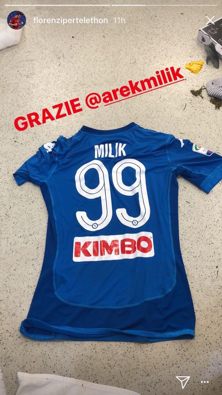 Come previsto, Arek Milik ha scambiato la sua maglietta con quella di Florenzi, altro sfortunato calciatore vittima di due infortuni al crociato consecutivi. "Ci vedremo al San Paolo e ci scambieremo la maglia, fieri della nostra forza e più forti del nostro destino", scrisse su Twitter il giocatore della Roma dopo l'infortunio del polacco. Così è andata, come testimonia lo scatto di Florenzi su Instagram.