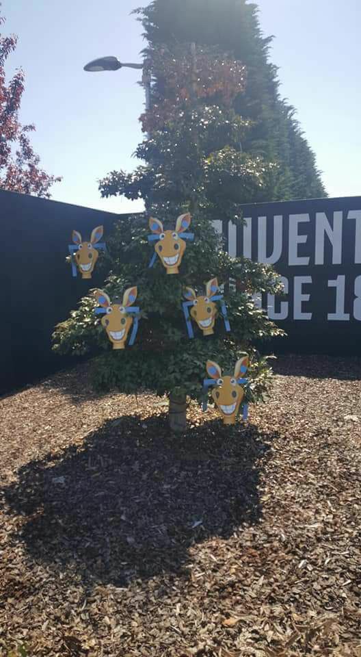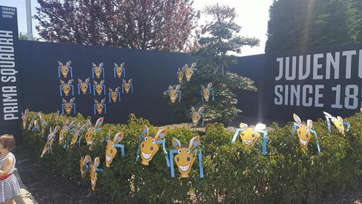 Inusuali immagini dal centro sportivo della Juventus a Vinovo: come mostrato dalla pagina Facebook SasoArts con alcune foto, l’ingresso del centro è stato ‘invaso’ da alcune sagome di ‘ciucci’ bordati d’azzurro, la mascotte storica del Napoli.