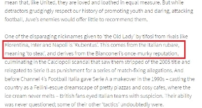 Sul sito ufficiale del Manchester United, presentando i precedenti con la Juventus, si fa riferimento a Calciopoli e al termine "Rubentus", utilizzato da tanti tifosi avversari per screditare i bianconeri. "Un soprannome dispregiativo dato alla Vecchia signora da tifosi rivali, come quelli di Fiorentina, Inter e Napoli, è Rubentus, dall'italiano rubare" si legge nel pezzo. "Questo soprannome deriva dalla reputazione, una volta oscura, dei bianconeri poi culminata nello scandalo di Calciopoli che ha portato alla revoca del titolo 2005 e alla retrocessione in serie B della squadra per partite truccate. Prima degli anni '90, quando la serie A fu dipinta anche in Inghilterra come bellissima, i tifosi britannici vedevano le squadre italiane con sospetto. Non erano in dubbio le loro abilità ma alcune delle loro tattiche" si legge sul sito dei Red Devils. Lo riporta Sportmediaset