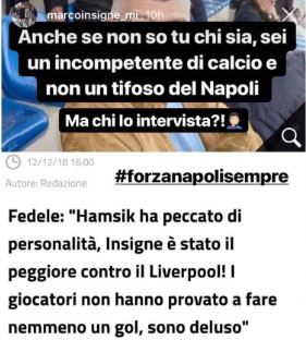 Dopo la sconfitta di Liverpool Enrico Fedele ha criticato il Napoli e, in particolar modo, Marek Hamsik e Lorenzo Insigne. Proprio per le parole negative spese per il numero 24 azzurro, è intervenuto su Instagram Marco Insigne, fratello di Lorenzo, che tramite una Stories ha così commentato: "Anche se non so tu chi sia, sei un incompetente di calcio e non un tifoso del Napoli. Ma chi lo intervista?!".