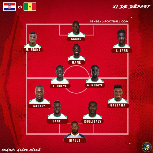 Senegal: A.Diallo; L. Gassama, K. Koulibaly, S. Sané, Y. Sabaly; A .N'Diaye, G. Gueye; M. Niang, S Mané (c), I. Sarr; D. Sakho