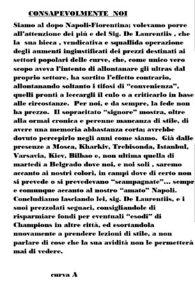 Un attacco, bello e buono, per scaldare ancora di più un clima a dir poco teso. Le Curve ce l'hanno con Aurelio De Laurentiis e in serata, dopo il match con la Fiorentina, la Curva A ha diramato un volantino mlolto duro contro il patron partenopeo. Di seguito lo mostriamo: