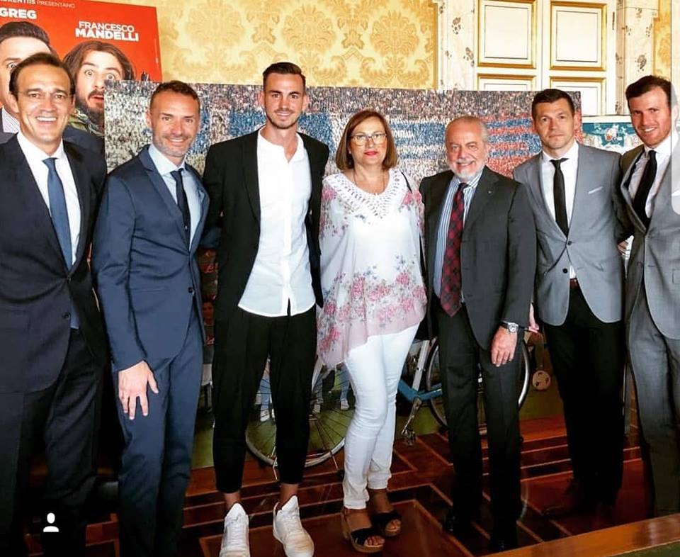 Fabian sorridente alla Filmauro: scatto con la madre e gli agenti della Youfirst dopo la firma col Napoli che lo legherà al club azzurro fino al 2023.
