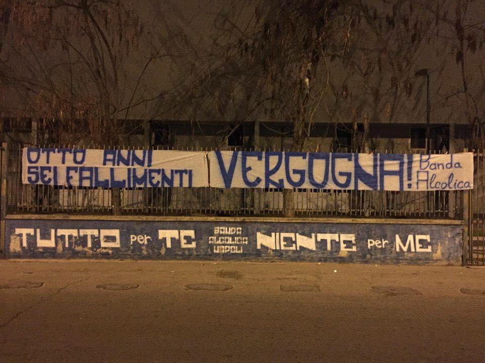 "Otto anni, sei fallimenti: vergogna!". Questo lo striscione, firmato dal gruppo 'Banda Alcolica', apparso all'esterno del Palabarbuto in merito all'ennesima delusione cittadina per gli appassionati di Basket. L'ultimo fallimento è toccato all'Azzurro Napoli Basket, escluso dal campionato di B.