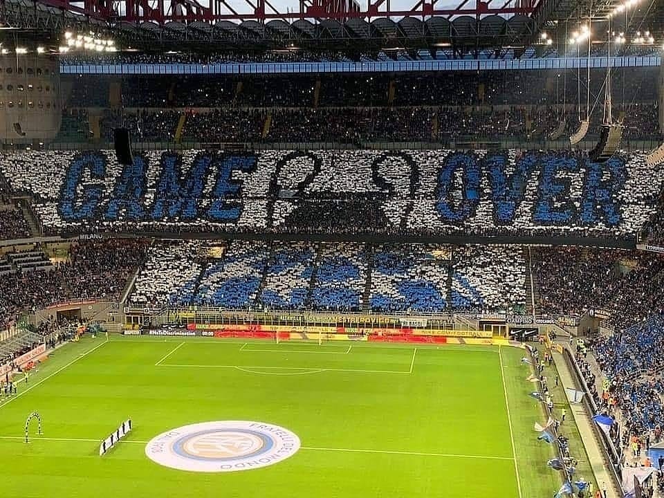 Bellissima coreografia da parte della curva dell'Inter: i tifosi accolgono la Juve con la scritta Game Over e nel mezzo la Champions League. Chiaro il riferimento all'eliminazione con l'Ajax da una competizione che i bianconeri non vincono da oltre vent'anni. Felici i nerazzurri, unica squadra italiana ad aver fatto triplete nel 2010. Ecco la foto: