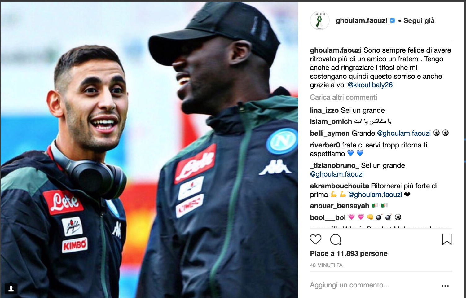 Bel messaggio postato su Instagram da Faouzi Ghoulam per il compagno Kalidou Koulibaly e per i tifosi azzurri. L'algerino sceglie una foto che lo ritrae in compagnia del difensore senegalese e scrive: "Sono sempre felice di avere ritrovato più di un amico un fratem (probabilmente usando la lingua napoletana, ndr). Tengo anche ad ringraziare i tifosi che mi sostengano quindi questo sorriso e anche grazie a voi"