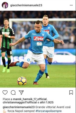"Grande vittoria! Avanti così. Forza Napoli sempre!". E' questo il messaggio scritto su Instagram da Emanuele Giaccherini dopo il successo di oggi contro il Sassuolo.