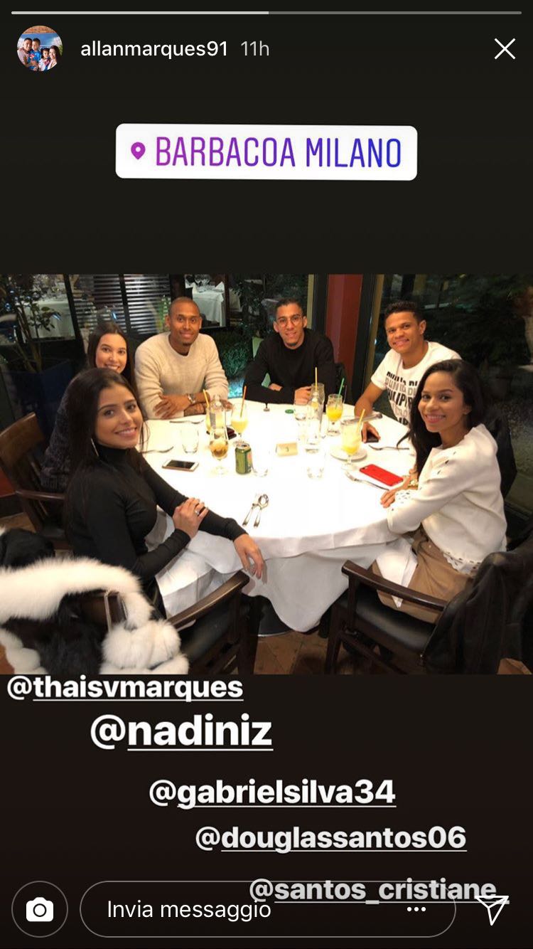 Giornata di relax a Milano per Allan. Il centrocampista azzurro ha postato una foto su Instagram con la sua dolce metà e in compagnia con Gabriel Silva, suo ex compagno all'Udinese. Ecco il post: