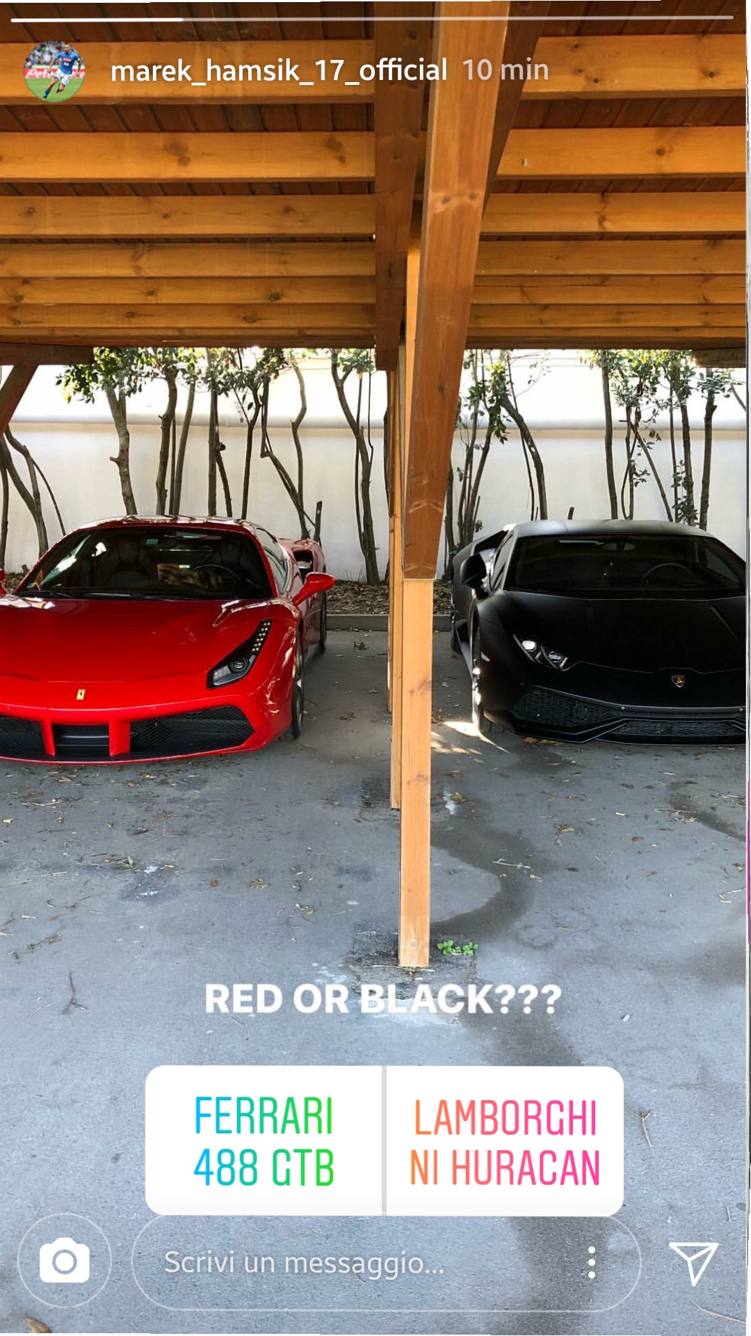 "Rossa o nera?". Con una storia pubblicata su Instagram Marek Hamsik mostra alcune delle sue automobili e propone il sondaggio tra la rossa Ferrari e la Lamborghini nera. In ogni caso, niente male...