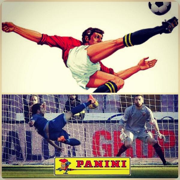 La splendida rovesciata di Higuain, che ha portato oggi in vantaggio il Napoli nel match con la Roma, è già un cult e sul web spuntano paragoni illustri: c'è già chi la paragona, infatti, a quella di Carlo Parola, riprodotta ogni anno sull'album Calciatori delle figurine Panini.