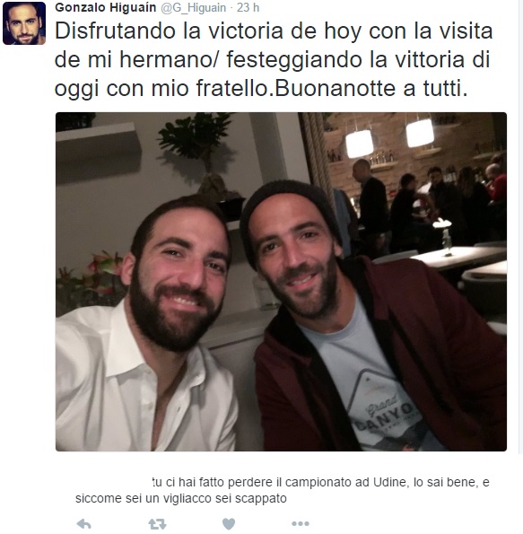 L'astio tra i tifosi del Napoli e Gonzalo Higuain continua a palesarsi ogni volta che l'argentino pubblica un messaggio sui suoi canali social. Il Pipita ha mostrato una foto in compagnia di un amico su Twitter, dicendo di "festeggiare la vittoria" con il fratello, scatenando una pioggia di risposte da parte dei partenopei. A parte i soliti censurabili insulti, in molti gli hanno ricordato la vittoria del Napoli a Udine, dove la scorsa stagione il Pipita si rese protagonista di una scenata costatagli tre giornate di squalifica.