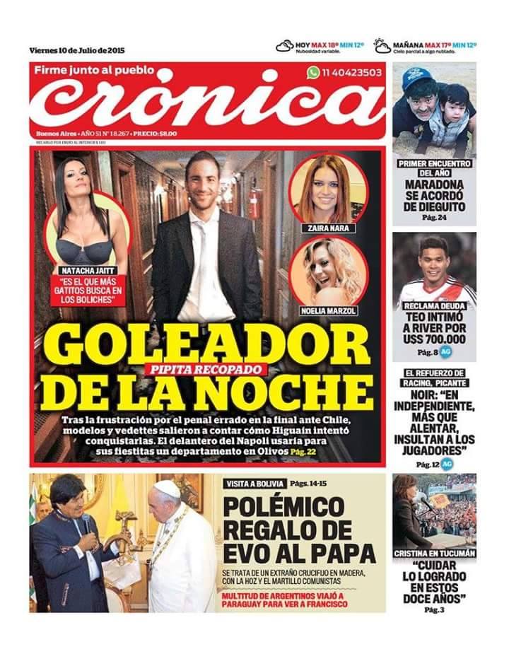 La Jaitt ha poi affondato il colpo: "Higuain è un malato di ragazze di quest'ambiente, è quello più attivo ed in cerca di 'prede' nella notte di Buenos Aires". Anche il giornale argentino "Cronica" ha ripreso le dichiarazioni della Jaitt in prima pagina dedicando al buon Gonzalo il titolo "il goleador della notte".
