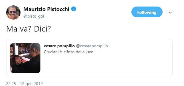 Presente all'evento organizzato dal portale Juventibus, Giuseppe Cruciani si è intrattenuto con il noto opinionista bianconero Cesare Pompilio, che ha pubblicato un'immagine con lui su Twitter affermando: "Cruciani è tifoso della Juve". Maurizio Pistocchi ha ritwittato la foto con un ironico commento, estremamente condivisibile: "Ma va? Dici?".