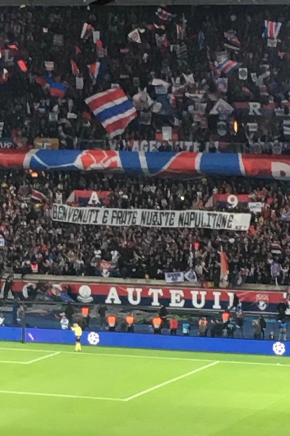 "Benvenuti e frate nuoste napulitane". Questo il simpatico striscione apparso nella curva del Psg durante la sfida al Napoli, ennesima dimostrazione del bel rapporto tra le due tifoserie.