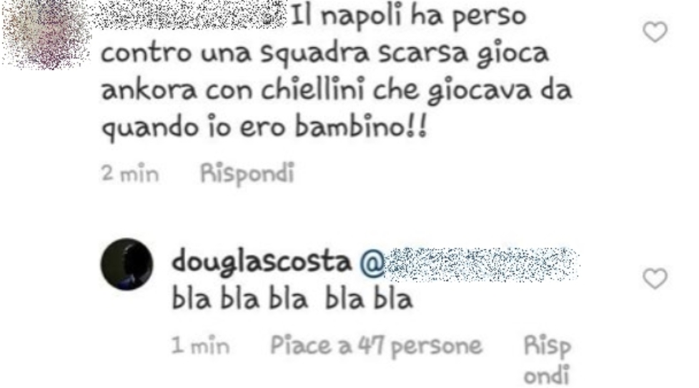 "Il Napoli ha perso contro una squadra scarsa, gioca ancora Chiellini che giocava da quando io ero bambino". Così scrive un appassionato di calcio sul profilo social dopo la partita tra Napoli e Juve. Douglas Costa replica al tifoso in un commento scrivendo "bla bla bla bla bla". In basso la foto pubblicata sulla sua edizione online da Tuttosport.