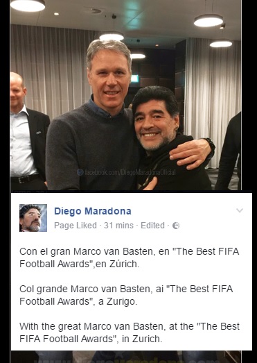 Incontro tra due giganti del calcio, a Zurigo, in vista dei "The Best FIFA Football Awards": Diego Armando Maradona ha pubblicato su Facebook una foto in compagnia dell'ex rossonero Marco Van Basten. "Col grande Marco van Basten, ai "The Best FIFA Football Awards", a Zurigo", questo il messaggio del Pibe de Oro.