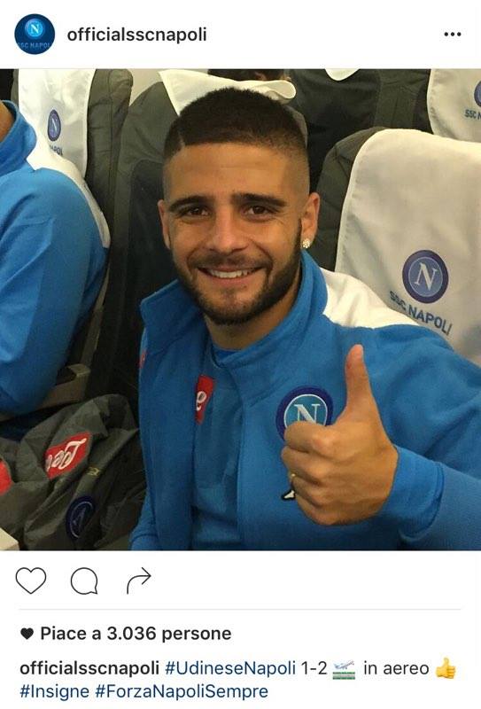 E' felice Lorenzo Insigne per la doppietta a Udine che gli permette di sbloccarsi dopo un lungo periodo a secco. Il talento di Frattamaggiore, in una foto postata su Instagram dalla SSC Napoli, si vede sorridente in aereo di ritorno dalla città friulana.