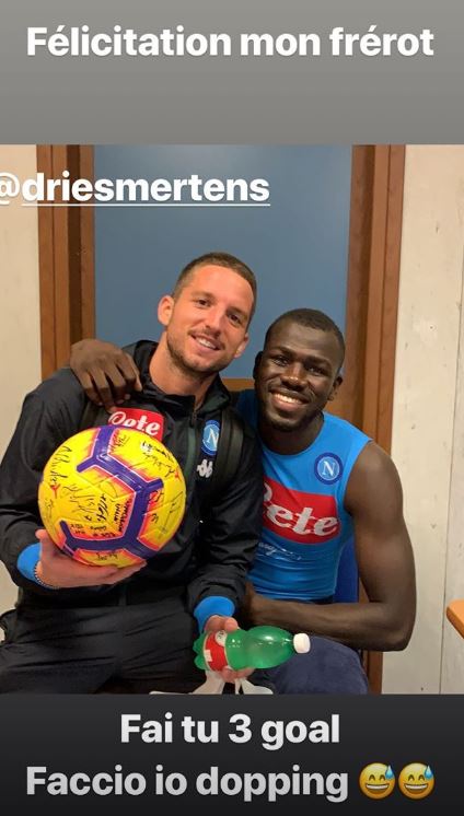 Clima sereno in casa Napoli dopo la vittoria contro l'Empoli. Cosi Kalidou Koulibaly ha pubblicato una foto su Instagram scherzando con Mertens: "Complimento fratello! Tui fai tre gol e io faccio il doping...".