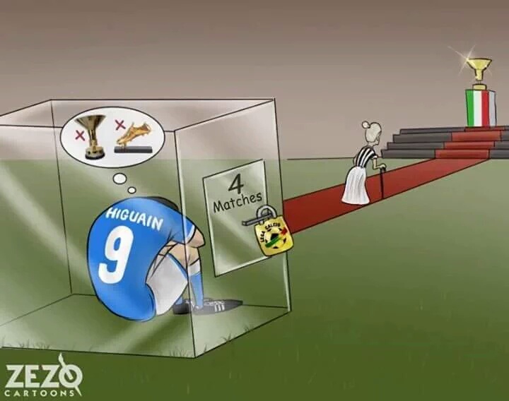 Lo stop imposto a Gonzalo Higuain ha fatto il giro del mondo. Anche i vignettisti di Zezo Cartoons hanno deciso di dedicare un loro lavoro alla vicenda. Un disegno che rappresenta perfettamente il triste finale di stagione della punta azzurra.