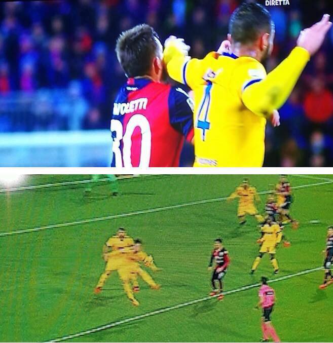 FOTO - Le immagini della vergogna bianconera: gomitata a Pavoletti e fallo di mano di Bernardeschi in area