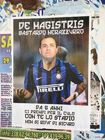 "De Magistris bastardo nerazzurro" e "Da 5 anni ci prendi per il culo. Con te lo stadio non si rifà di sicuro" sono le scritte stampate sui manifesti nei quale il viso del sindaco di Napoli, noto tifoso della squadra della città, è stata "montata" sul corpo di un calciatore che indossa la maglia dell'Inter.
