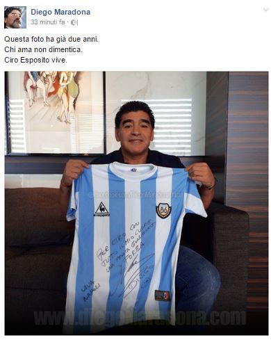 "Questa foto ha già due anni. Ciro Esposito vive. Chi ama non dimentica". L'autore di questo post di Facebook è Diego Armando Maradona pubblicando una foto postata quando Ciro era in ospedale. Diego in quell'occasione scriveva su una maglia dell'Argentina: "Per Ciro con tutto il mio cuore una pronta guarigione".