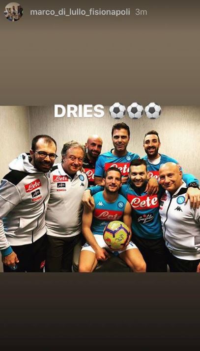Una tripletta da urlo per Mertens, pronto a portare il pallone a casa dopo la vittoria contro l'Empoli. Cosi il giocatore azzurro ha festeggiato anche con lo staff medico del Napoli al completo, come mostra la foto pubblicata dal massofisioterapista azzurro Marco Di Lullo.