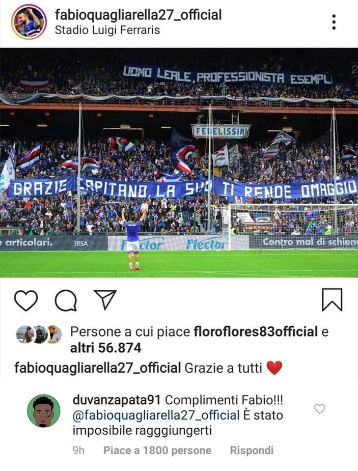 FOTO - Quagliarella-Zapata, bel siparietto social: "Complimenti Fabio, impossibile raggiungerti"
