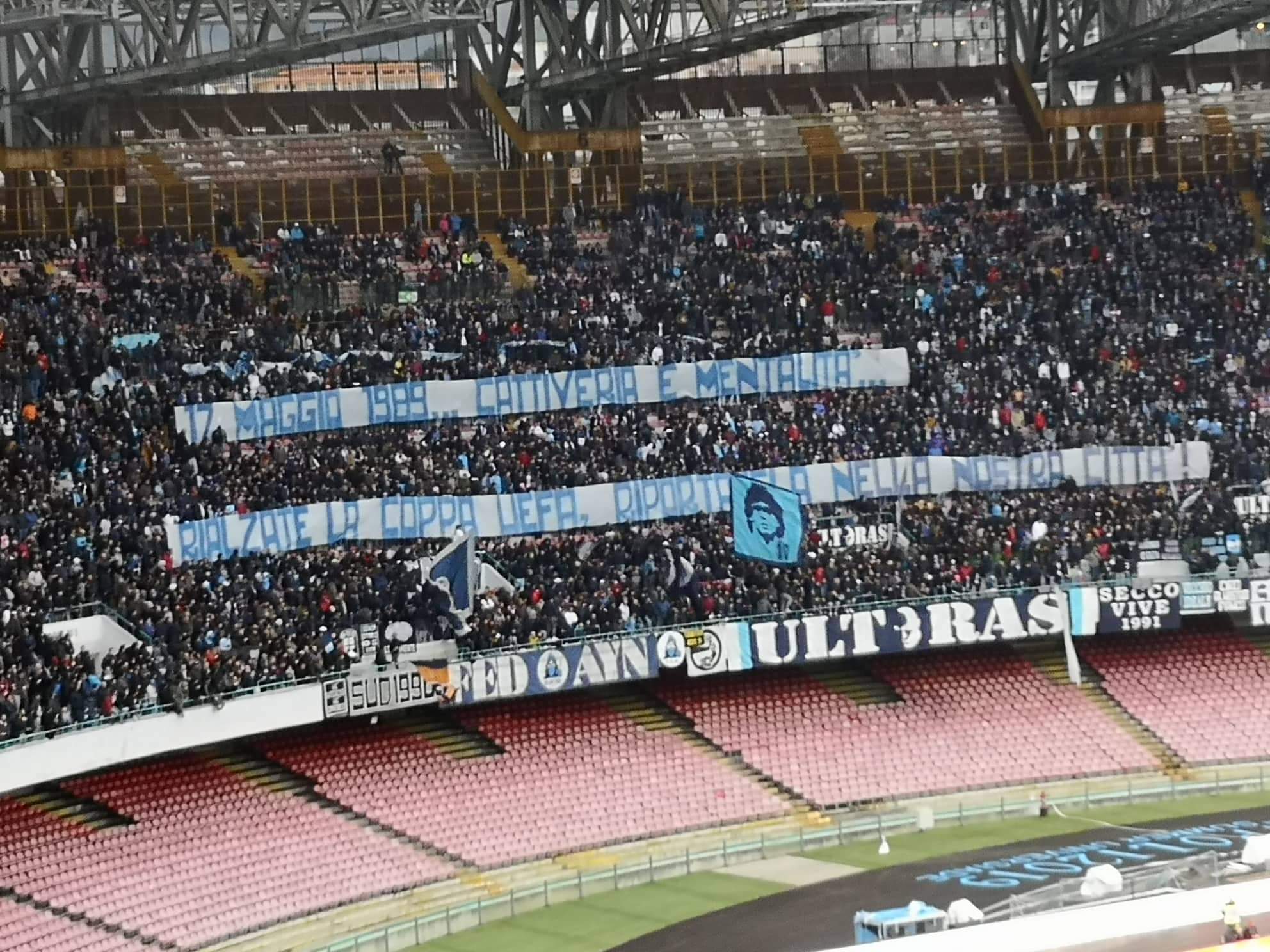 I tifosi del Napoli vogliono l’Europa League. Questo il messaggio lanciato con uno striscione esposto dalla Curva B prima dell’inizio della sfida alla Spal: “17 maggio 1989, cattiveria e mentalità. Rialzate la Coppa Uefa, Riportatela nella nostra città” in riferimento alla data del trionfo europeo contro lo Stoccarda.