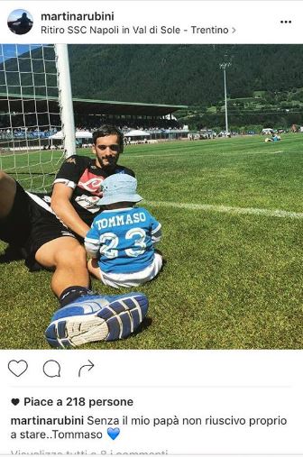 "Senza il mio papà non riuscivo proprio a stare". Questa la frase pubblicata su Instagram da Martina Rubini, moglie di Manolo Gabbiadini, che ha postato una foto che ritrae l'attaccante azzurro insieme con suo figlio Tommaso, con la maglia azzurra ed il numero 23 sulle spalle. La compagna di Manolo insieme con il figlio hanno raggiunto il calciatore ex Bologna nel ritiro di Dimaro.