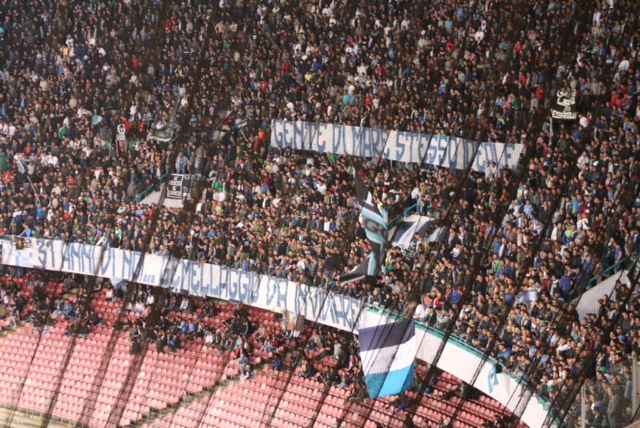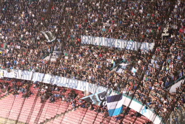 Questo lo striscione comparso in Curva A in merito al gemellaggio che lega le tifoserie di Napoli e Genoa dal 1982.