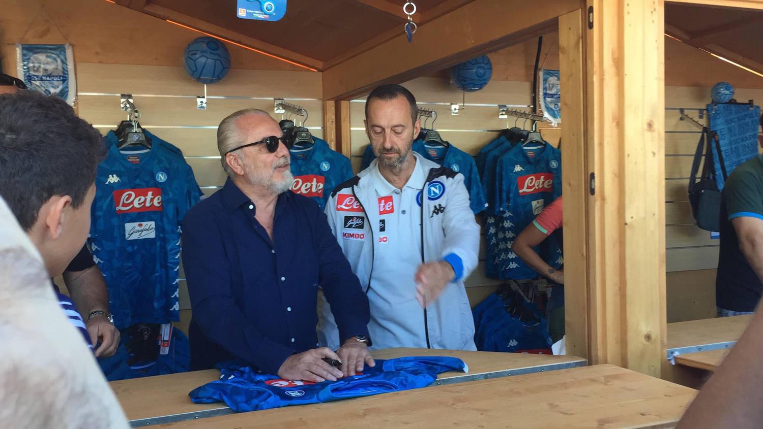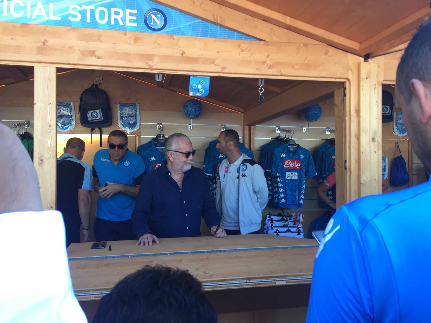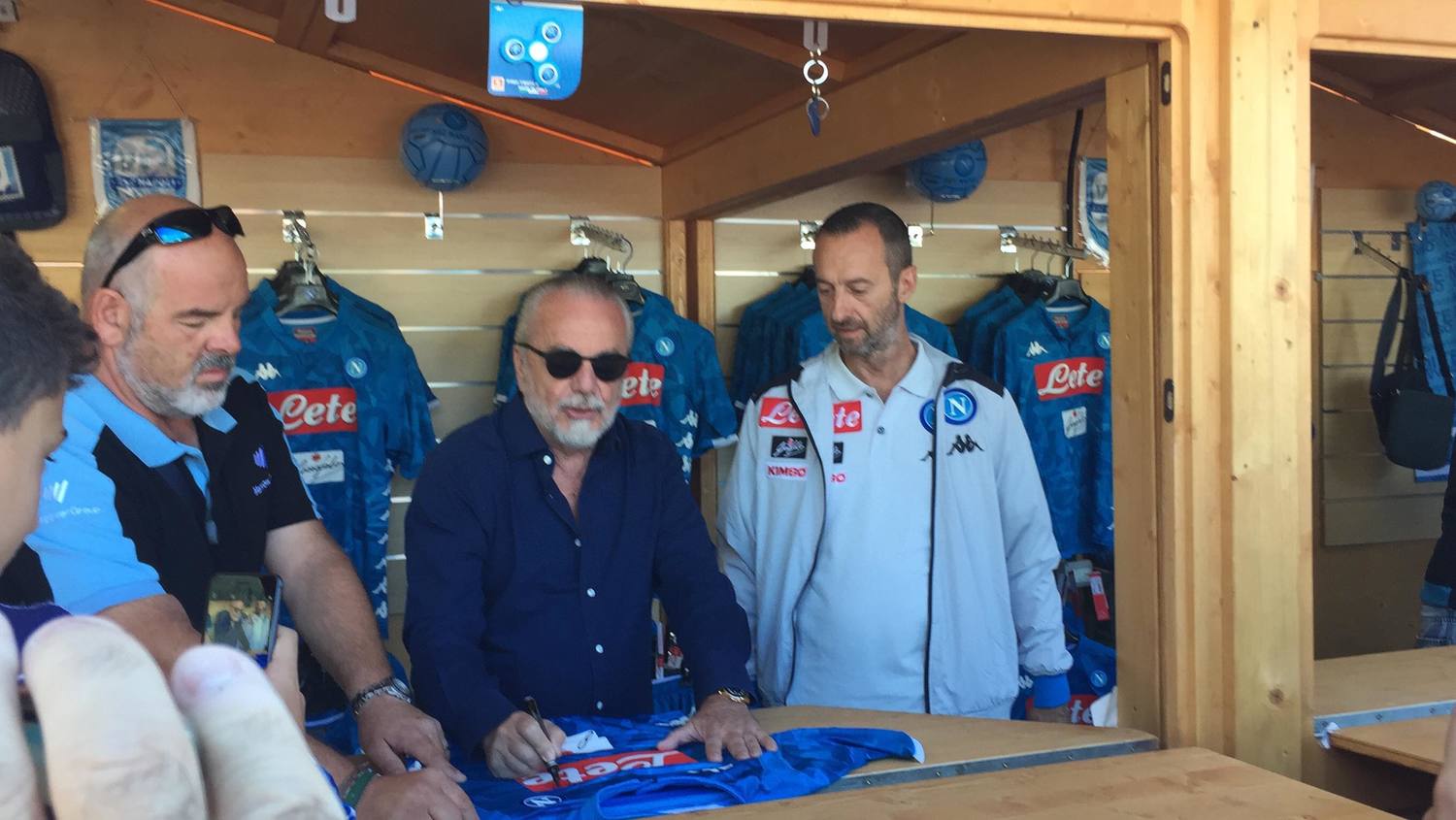 Anche questa mattina De Laurentiis era presente allo store di Dimaro per autografare le maglie del Napoli. Motivo in più per i tifosi per acquistare le nuove divise da gioco Kombat 2019. Ecco le foto: