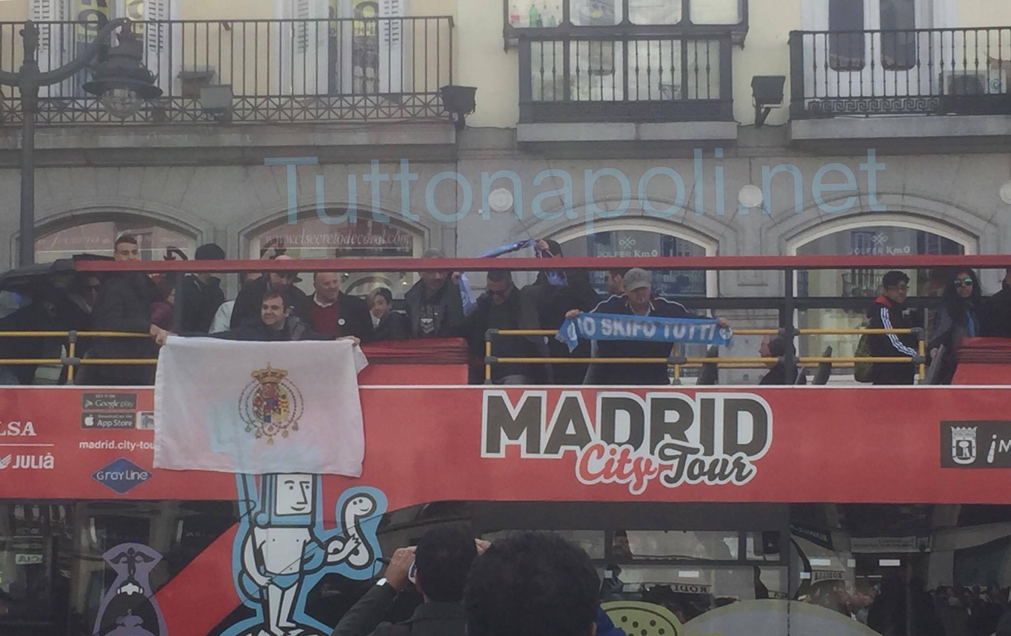 L'entusiasmo del tifo azzurro si respira in ogni angolo delle strade di Madrid. Anche dal pullman panoramico, come riportano le immagini dei nostri inviati, i tifosi napoletani stanno facendo sentire il proprio entusiasmo con cori e incitamenti. Come si vede dalla foto, tra i supporters spunta anche una bandieria del Regno delle due Sicilie.