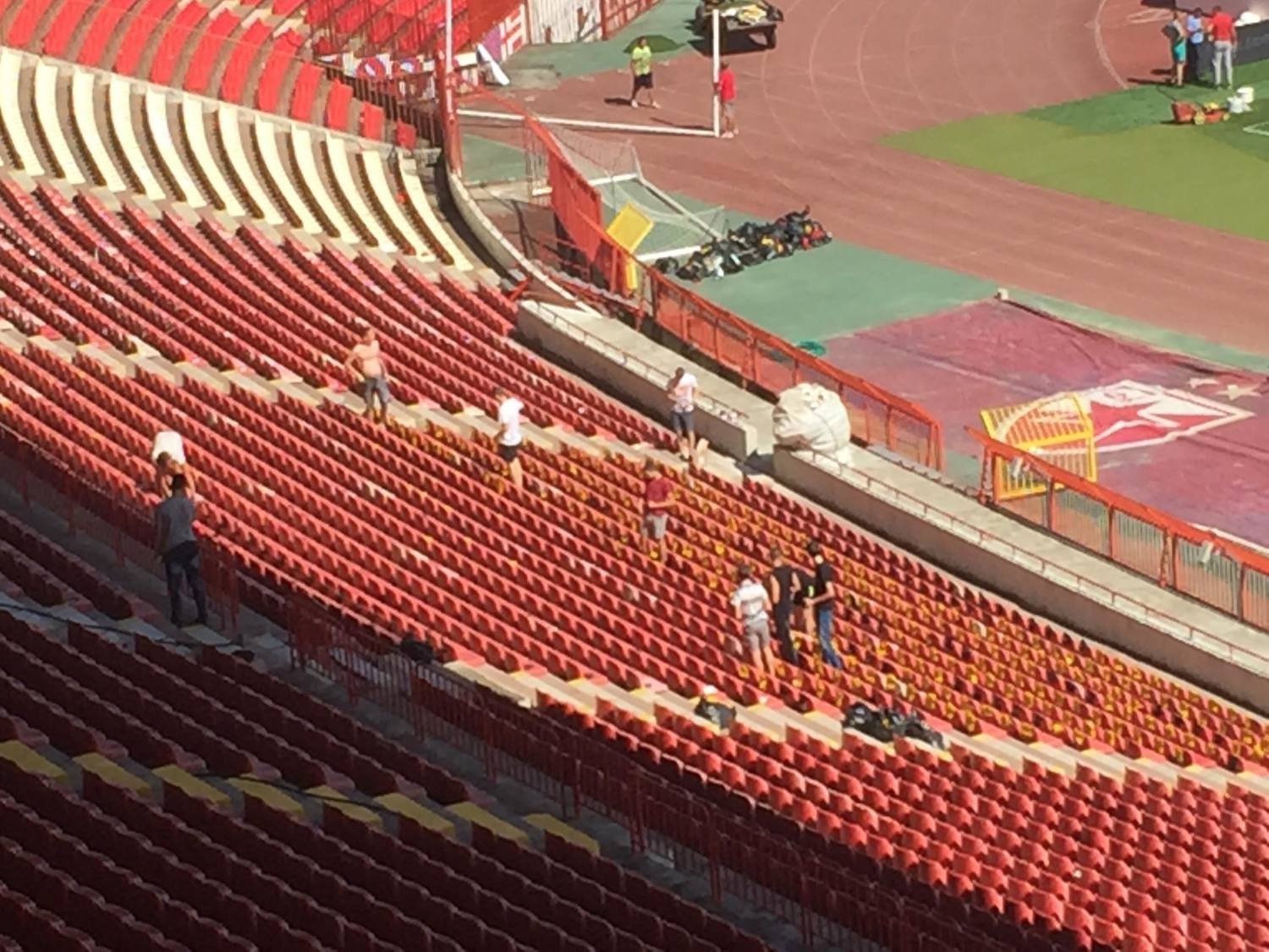 Attesa febbrile a Belgrado. I tifosi della Stella Rosso sono già al lavoro per preparare una scenografia che, dicono, sarà incredibile per lo storico ritorno nella massima competizione europea dopo 26 anni. Nella foto dei nostri inviati potete vedere alcuni tifosi al lavoro per l'allestimento.