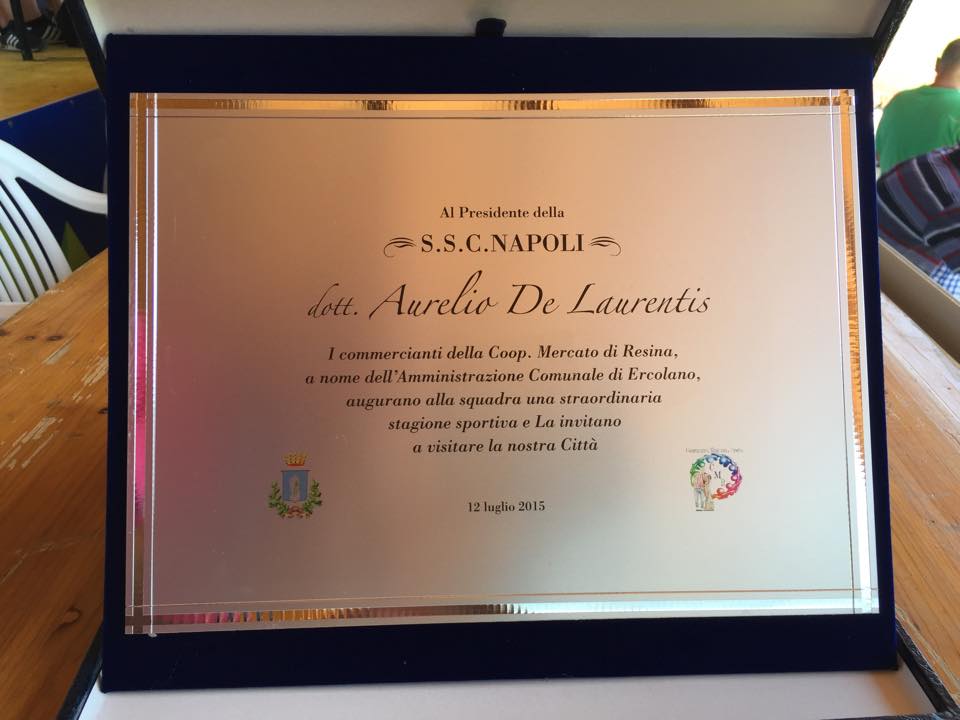 FOTO TN - De Laurentiis, targa di buon augurio dalla Cooperativa Mercato di Resina