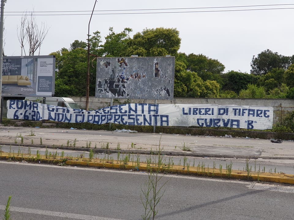 Sabato scorso, ci furono importanti momenti di tensione a Roma, durante la manifestazione organizzata dagli esponenti di estrema destra come "Forza Nuova" e alcuni gruppi ultrà, tra i quali non vi erano quelli del Napoli. A conferma dell'assenza dei supporters azzurri, è stato esposto uno striscione all'esterno del San Paolo, degli Ultras della Curva B che recita: "6/6/2020, Roma, chi si presenta, non ci rappresenta. Liberi di tifare"