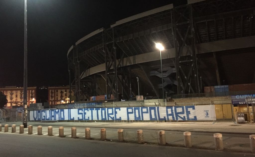 "Vogliamo il settore popolare" è quanto si legge su uno striscione all'esterno dello stadio San Paolo. Chiaro il riferimento alla protesta per i prezzi di Napoli-Fiorentina, con curve a 35 euro (clicca qui per tutti i prezzi)