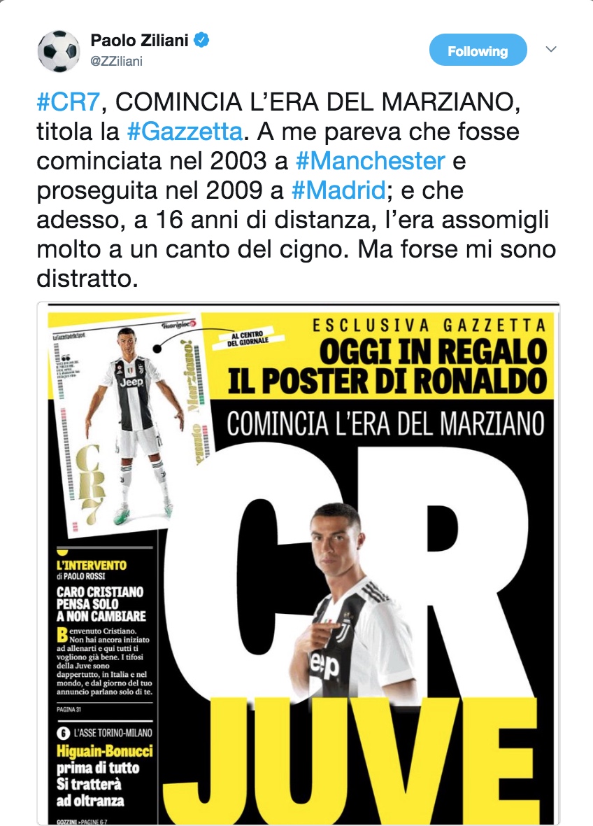 Inizia l'era del marziano. Così oggi titolava La Gazzetta dello Sport sull'arrivo a Torino di Cristiano Ronaldo, scelta che Paolo Ziliani ha così commentato con questo velenoso post su Twitter: "A me pareva che l'era di Cristiano Ronaldo fosse cominciata nel 2003 a Manchester e proseguita nel 2009 a Madrid; e che adesso, a 16 anni di distanza, l’era assomigli molto a un canto del cigno. Ma forse mi sono distratto".