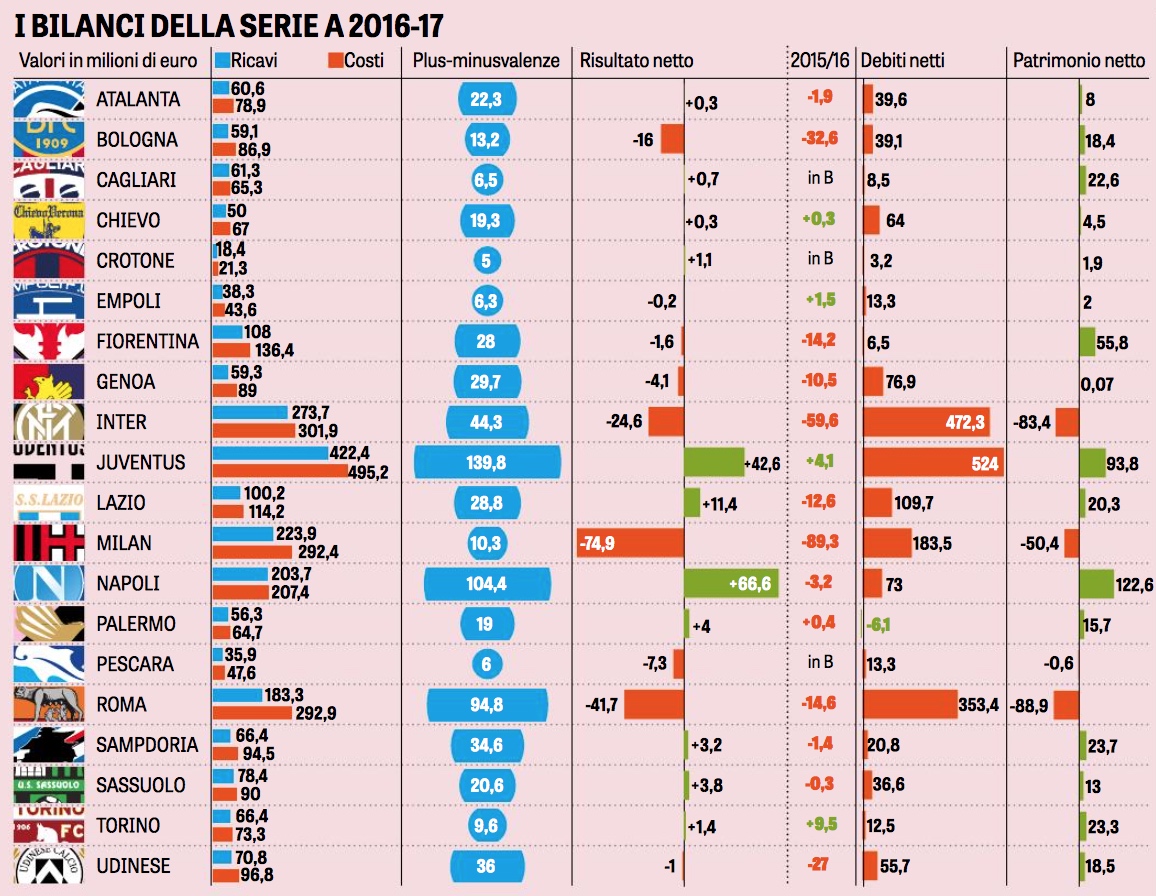 GRAFICO - Bilanci Serie A: Juve nettamente in testa, crescita storica per il Napoli